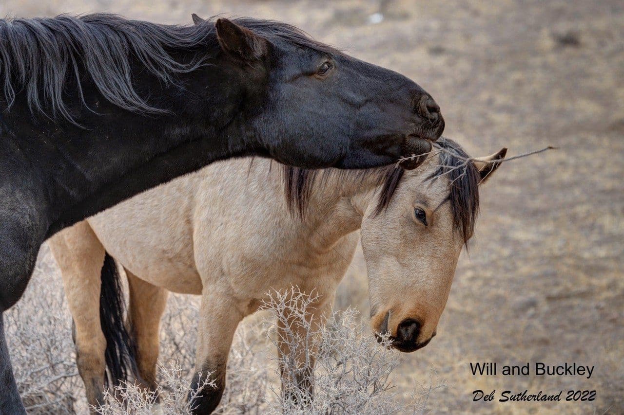 Soon after that, Shaggy was found alone on the range and his band was nowhere to be seen! Shaggy has had his family for many years, and it was hard to watch him travel from one end of the valley to the other, searching and calling out for them. A few weeks later, I found Shaggy’s band in a field and was excited to see that they were all accounted for, all except for Granny, Shaggy’s oldest mare. I expected to see Shaggy with them in the field, but to my surprise, they were with a beautiful black stallion, it was Will! Will and Shaggy’s colt Buckley seemed to get along well and played with each other in between taking bites from the same bush.