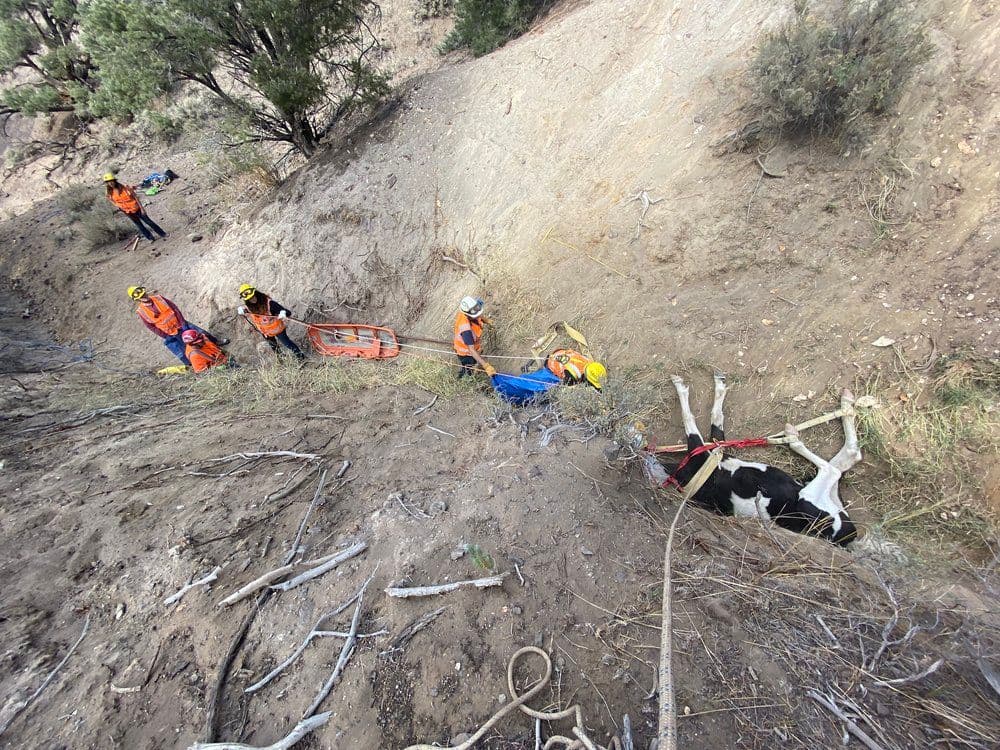 The rescue team deployed and loaded their rescue trailer up with various equipment. They arrived at the trailhead which is as far as most of the vehicles could go. They loaded everything they could onto a Stokes basket (meant for carrying an injured person) and put it into one member’s four-wheel drive. Unfortunately, he was only able to drive another half a mile. From there the team took turns hiking the equipment the last mile to the horse.