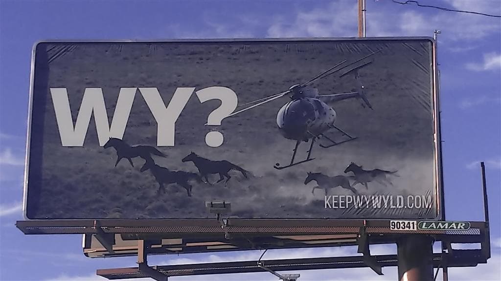 The billboards are part of the organization’sKeep WY Wyldcampaign, a nationwide awareness andadvocacycampaign created to educate the public about the plight of Wyoming’s wild horse herds. The advertisements, which flank the I-80 corridor between Green River and Lander, pose the question, “WY?” to passersby with accompanying artwork of wild horses being stampeded by government-contracted helicopters and dispiritedmustangson trucks.