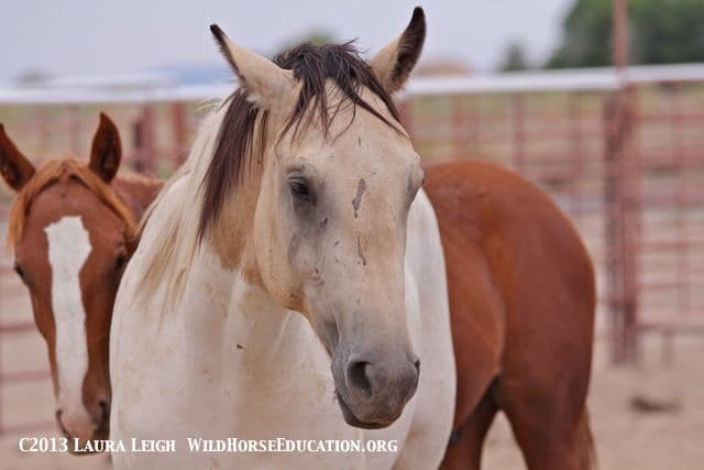 Inspection of pens – in response to the judge’s TRO barring the sale of unbranded colleagues. The horses we observed were frightened, avoided human contact and became agitated when we looked at them. They behaved as I have seen wild horses behave atBLMholding facilities -- clustering together in a back corner of the pen, ears pinned, avoiding eye contact, then running together in circles when pressured with human contact.