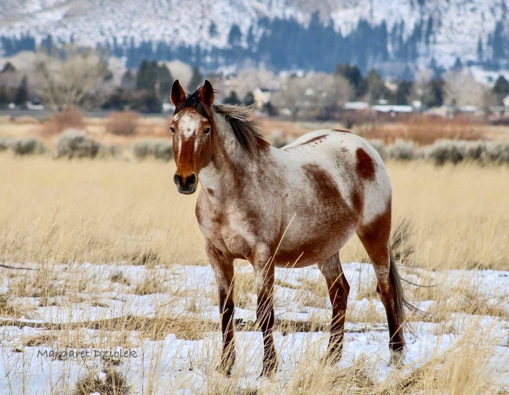 Annabelle Mayhas been with Virginia Range stallion, Hammer, for years. She has a lovely roan coat and also exhibits appaloosa characteristics. As steadfast as she is beautiful, her wide-set eyes give her the look of wisdom and help her to see her surroundings. Known to be a wonderful mother to her past foals, she is also wary and cautious.