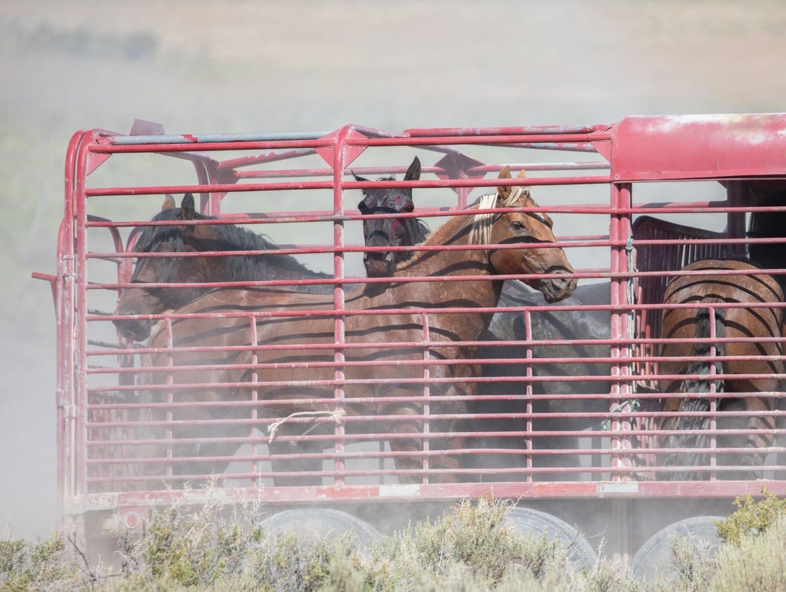 A trailer hauling the first group to temp holding came by. The road looked quite rough. They stopped for a few minutes. I observed the driver grab a stick off a bush and poke it into the trailer. TheBLMthen drove up and assisted. I asked what had happened, and he said a horse fell down in the back, and they used the stick to prompt her to get back up. He said she had been kicked in the face. As the trailer passed, I could see blood on that horse's head.